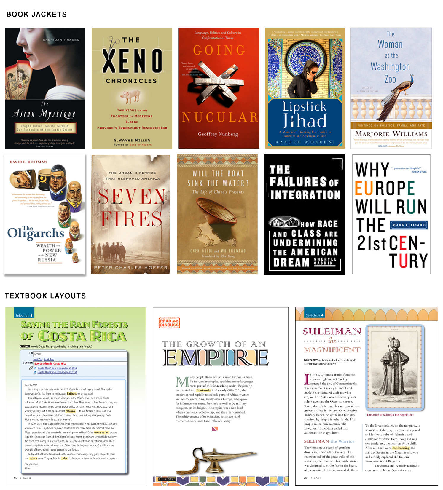 Sample book jackets and textbook layouts