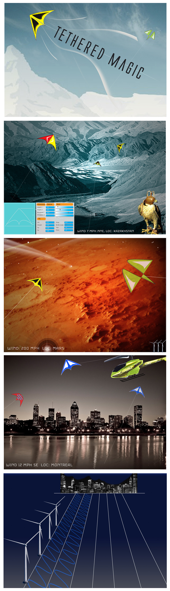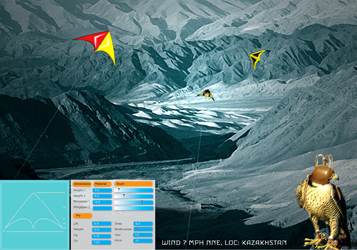 Tethered Magic is my invented kite interaction game. The object is to build your own kite using NASA modeling software and set weather conditions. Maneuver through challenges-ie, the Khyber Pass, or a city of skyscrapers, by using a smart device’s motion sensor or keypad. Earn kilowatt points to power cities and cars.