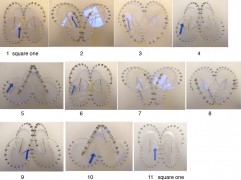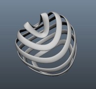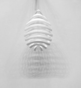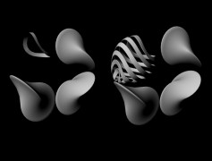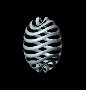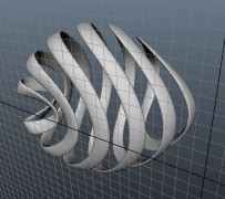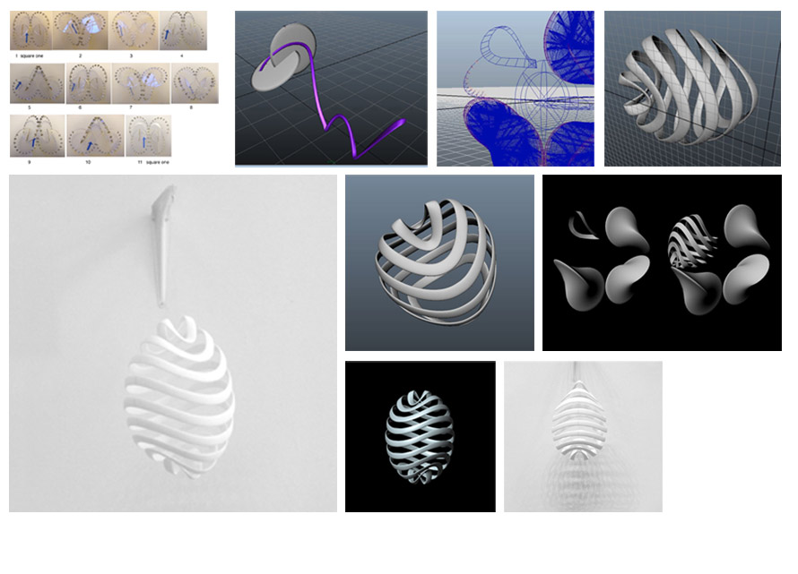 For this sculpture, I began observing sequences by keying points on the physical model of the oloid quartet as it rolled. Then, in 3-d motion software and with the aid of my thesis advisor, one point on a single oloid rolling forward was extracted into a solid motion-form. That pathway had compound curves and peaks and valleys which I could not have imagined by mere observation. And finally, multiple ribs on a pair in an oloid quartet were defined as they moved along the full circuit of the mobius movement. For this, key arcs were delineated along the outermost edge of one oloid separated by a space until the entire profile was specified. The ribs of motion that formed during one cycle were then extruded into solids, 3-D printed and reassembled into a moving sculpture with its own unique visual properties.