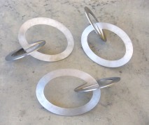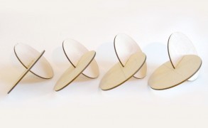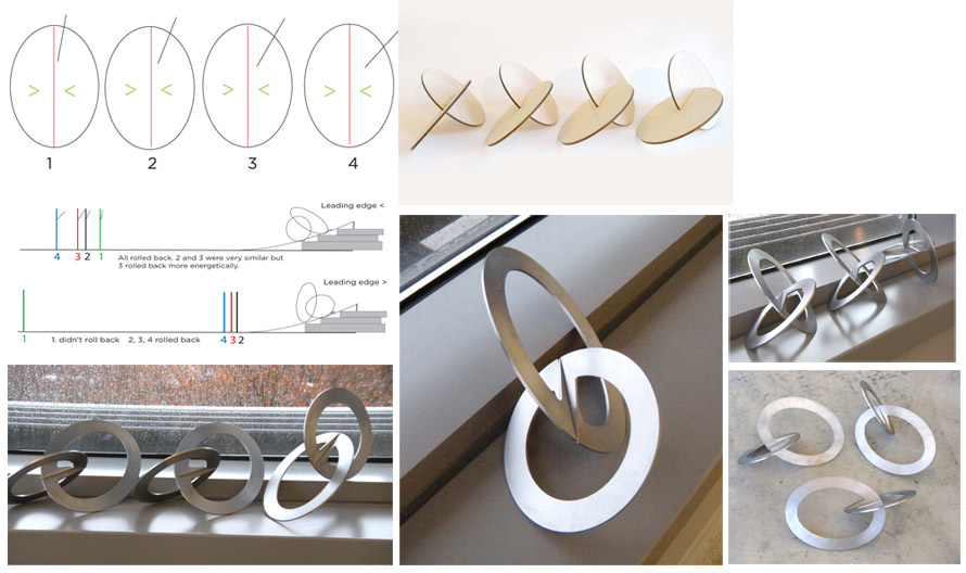 These process shots show multiple iterations and experiments explored to find the optimal boomerang-like motion. The more disparate the centers of gravity between the circle and the ellipse depends on the acuteness of the angle of attachment. The object oscillates as it seeks equilibrium. Crafted in both steel and wood, for more information see parachute.