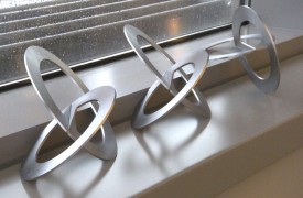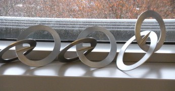 This sculpture takes the oloid in another direction. Attaching an ellipse and a circle at an angle other than 90° results in a form that rolls back and forth like a pendulum.