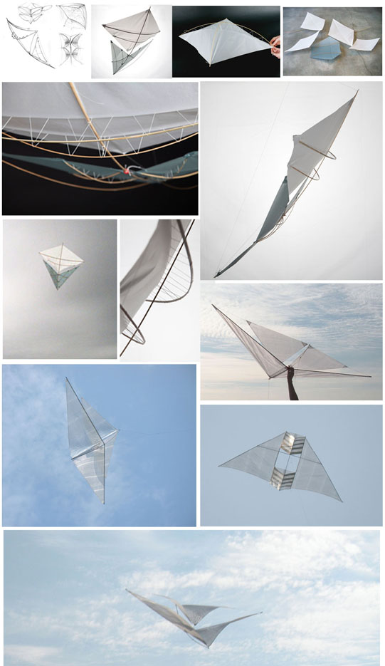 I have been exploring kite making for the past few years. I am inspired both by Kenneth Snelson’s pioneering tension/compression structures as well as more traditional kite-making approaches. The various kites shown here are made with bamboo and ripstop, or carbon fiber and cubitech sail cloth.